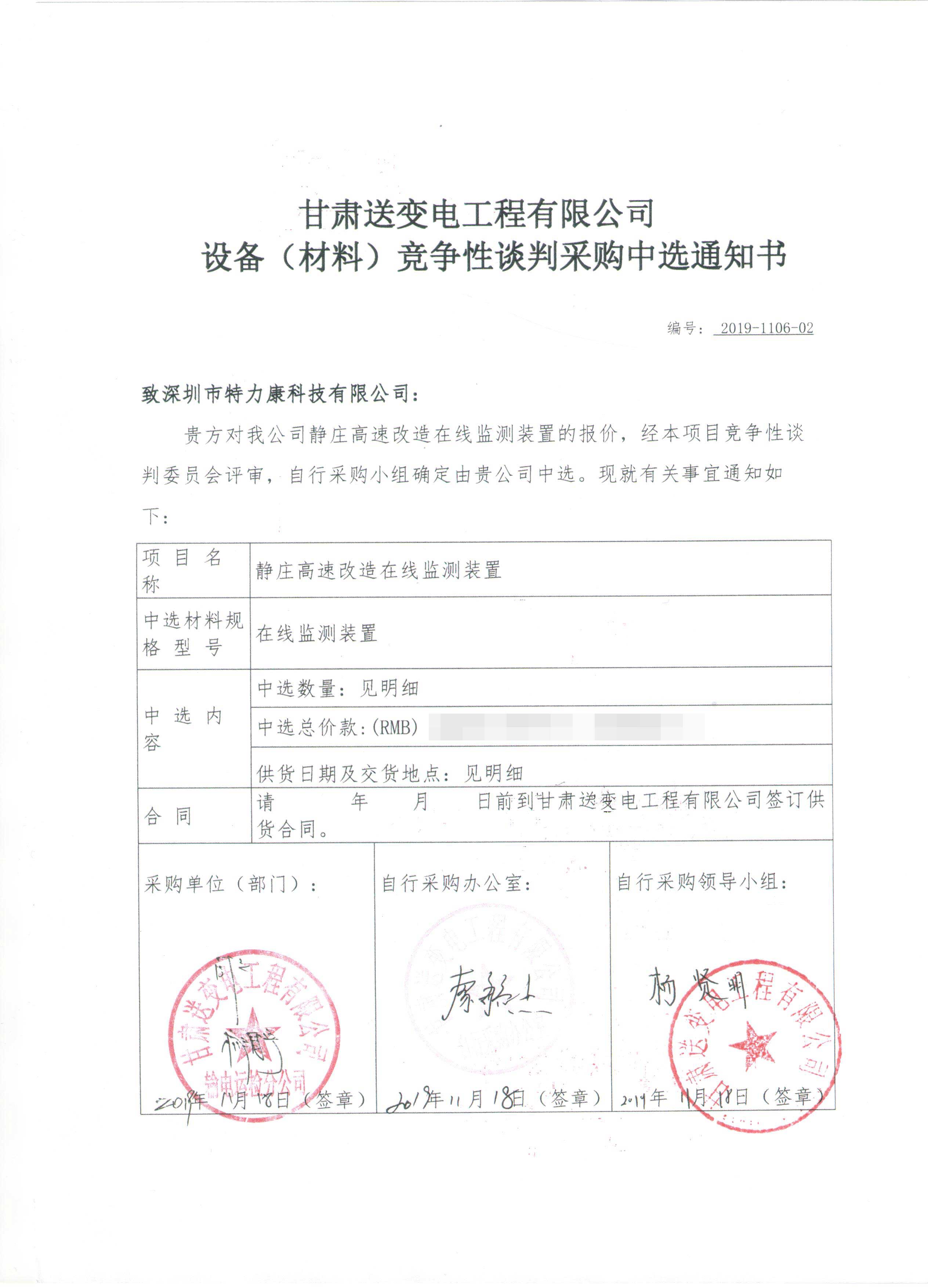 甘肅送變電工程有限公司智慧輸電線路建設(shè)視頻監(jiān)測裝置及靜莊高速改造在線監(jiān)測裝置競爭性談判采購工作已經(jīng)結(jié)束,根據(jù)評審委員會評審結(jié)果,招投標(biāo)領(lǐng)導(dǎo)小組批準(zhǔn),確定此次甘肅送變電工程有限公司智慧輸電線路建設(shè)視頻監(jiān)測裝置及靜莊高速改造在線監(jiān)測裝置競爭性談判采購由我司深圳市特力康科技有限公司中標(biāo),現(xiàn)將公告示下: