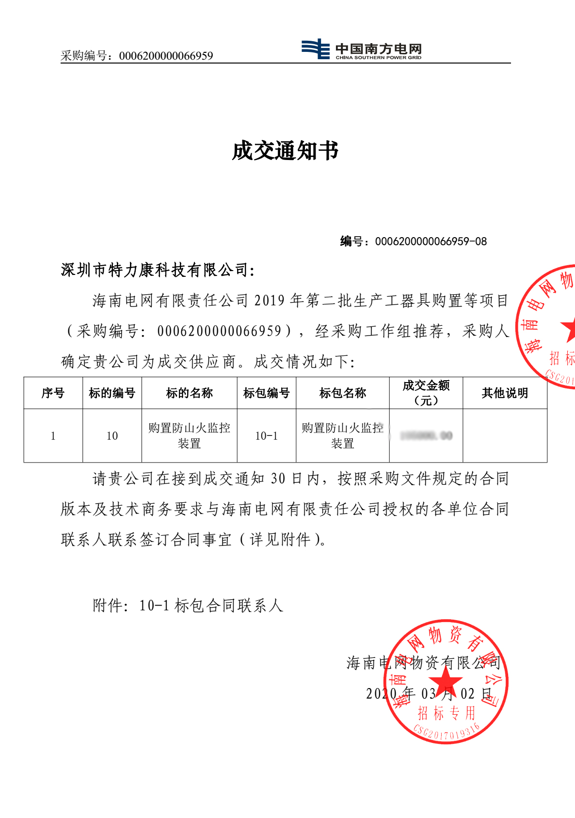 海南電網(wǎng)有限責(zé)任公司2019年第二批生產(chǎn)工器具購等項(xiàng)目(采購編號(hào); 0000660509 )采購工作已完成。經(jīng)采購工作組推薦,采購人確定我司(深圳市特力康科技有限公司)成為本此標(biāo)包5-1購置輸電專業(yè)防外力破壞激光指向儀及標(biāo)包10-1購置防山火監(jiān)控裝置的成交供應(yīng)商,附成交通知書如下: