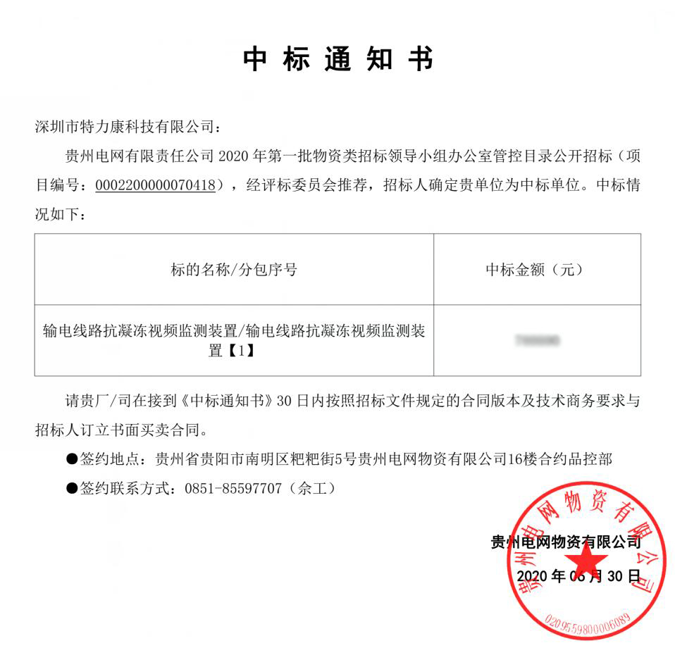 我司(深圳市特力康科技有限公司)在投標貴州電網有限責任公司2020年第一批物資類招標領導小組辦公室管控目錄公開招標(項目編號: 0000000070418) 中輸電線路抗凝凍視頻監測裝置標包,經評標委員會推薦,招標人確定我司為中標單位。特發中標通知書,如下: