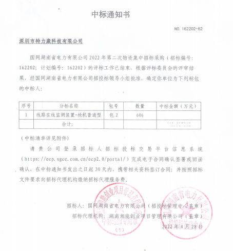 國網湖南省電力有限公司2022年第二次物資集中招標采購(招標編號:162202;計劃編號: 162202) 的評標工作已結束,根據評標委員金的評審結果。經國網湖南省電力有限公司招投標領導小組批準。確定我單位為下列標包(線路在線監測裝置- 槍機普通型)中標人,中標通知如下: