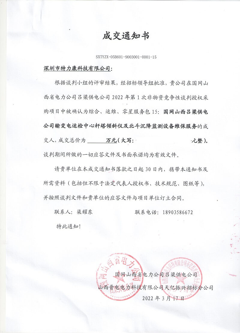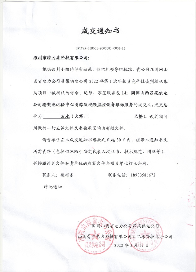 特力康中標(biāo)國網(wǎng)黑龍江送變電工程公司的2024年度第18次物資類競爭性談判采購項(xiàng)目——慶陽驅(qū)鳥器物資框 特力康中標(biāo)國網(wǎng)甘肅省電力公司省管產(chǎn)業(yè)單位2024年第五次物資競爭性談判授權(quán)采購項(xiàng)目 中標(biāo)喜訊:深圳市特力康科技有限公司成功入圍許繼集團(tuán)綜合能源公司輸電線路視頻在線監(jiān)測裝置模塊集采項(xiàng)目 中標(biāo)喜訊:特力康成功中標(biāo)國網(wǎng)重慶市電力公司渝中一片區(qū)項(xiàng)目 特力康成功中標(biāo)國網(wǎng)天津市電力公司2024年第二次?物?資招標(biāo)項(xiàng)目 特力康中標(biāo)國網(wǎng)安徽省電力有限公司蕪湖供電公司2024年3月非物質(zhì)采購項(xiàng)目 四川電力用特力康架空輸電線路山火監(jiān)測裝置,筑牢林區(qū)輸電 “防火墻”? 遼寧電力啟用特力康多視角監(jiān)拍裝置,全維度守護(hù)輸電安全? 破解黃土高原沉降難題:山西電力用特力康北斗裝置守桿塔安全? 山東電力啟用特力康動(dòng)態(tài)版智能激光驅(qū)鳥器,動(dòng)態(tài)防控守護(hù)變電站安全? 湖南超高壓電力啟用特力康球機(jī) AI 監(jiān)測裝置,智能守護(hù)輸電通道安全? 廣西電力啟用特力康高壓電纜護(hù)層環(huán)流監(jiān)控設(shè)備,筑牢電纜安全防線? 山東電力用上特力康綜合驅(qū)鳥器,多手段守護(hù)變電站安全? 陜西電力啟用特力康智能預(yù)警系統(tǒng),多維監(jiān)測守護(hù)輸電安全? 寧夏配電線路安裝了我司防外破電子化智能警示牌