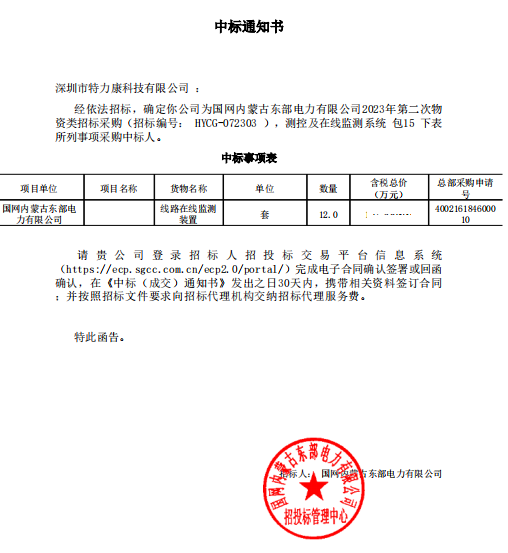 經依法招標,確定我司為國網內蒙古東部電力有限公司2023年第二次物資類招標采購(招標編號: HYCG -072303 ),測控及在線監(jiān)測系統(tǒng)包15下表所列事項采購中標人。中標通知如下: