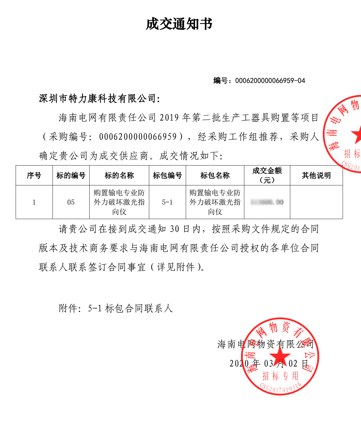 海南電網(wǎng)有限責(zé)任公司2019年第二批生產(chǎn)工器具購等項(xiàng)目(采購編號(hào); 0000660509 )采購工作已完成。經(jīng)采購工作組推薦,采購人確定我司(深圳市特力康科技有限公司)成為本此標(biāo)包5-1購置輸電專業(yè)防外力破壞激光指向儀及標(biāo)包10-1購置防山火監(jiān)控裝置的成交供應(yīng)商,附成交通知書如下: