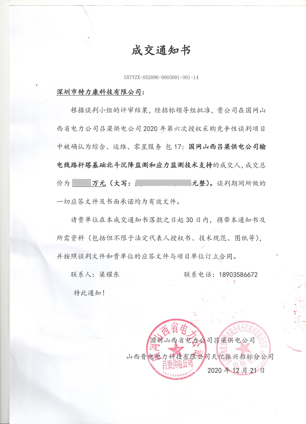 根據談判小組的評審結果,經招標領導組批準,貴公司在國網山西省電力公司呂梁供電公司2020年第六次授權采購競爭性談判項目中被確認為綜合、運維、零星服務包17:國網山西呂梁供電公司輸電線路桿塔基礎北斗沉降監測和應力監測技術支持的成交人,成交通知如下: