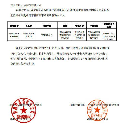 經依法招標。確定我司為國網甘肅省電力公司2021年+電網零星物資及辦公用品框架招標采購項目下表所列事項采購貸物中標人。中標通知如下: